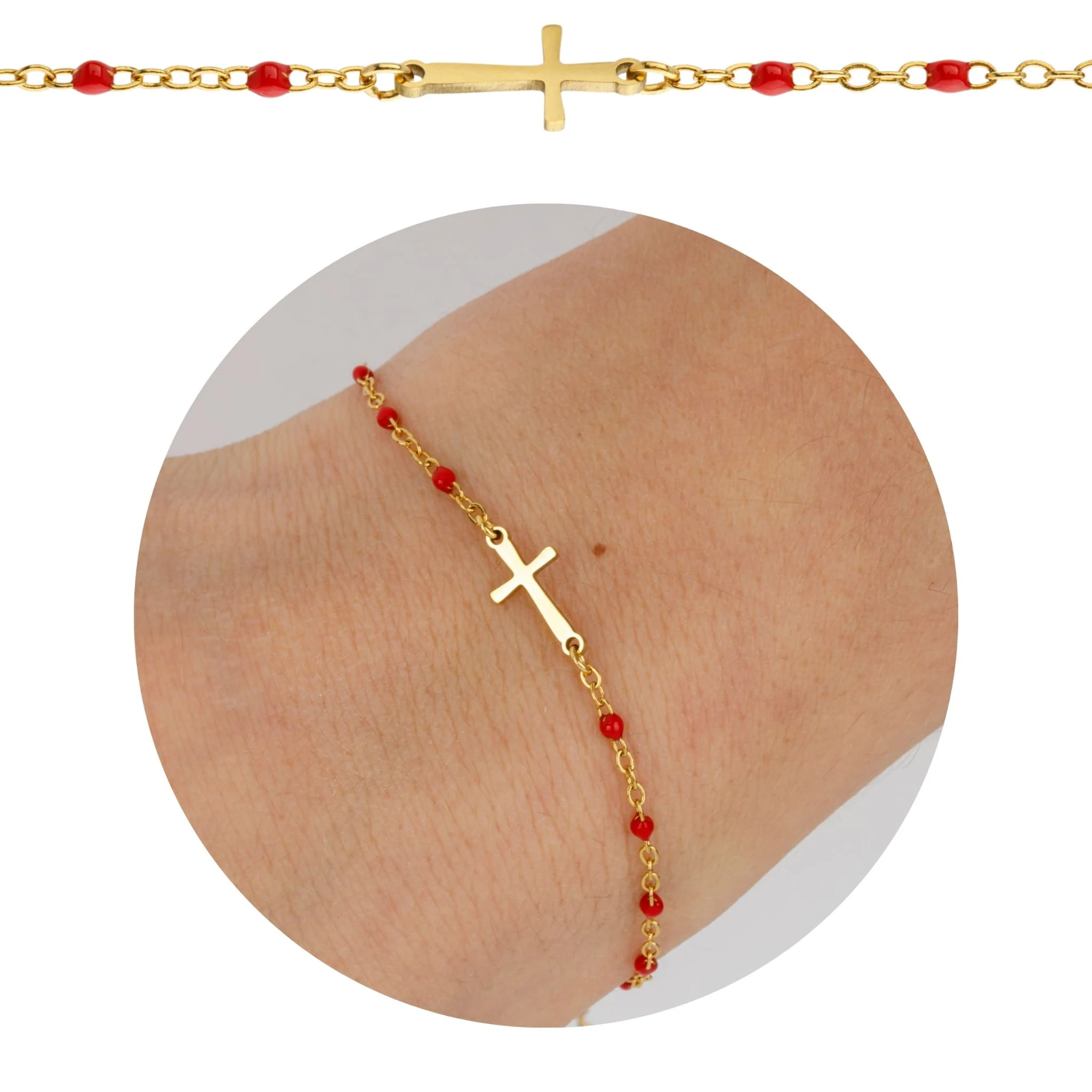 wzór: łańcuszek z koralikami i krzyżykiem ze stali nierdzewnej