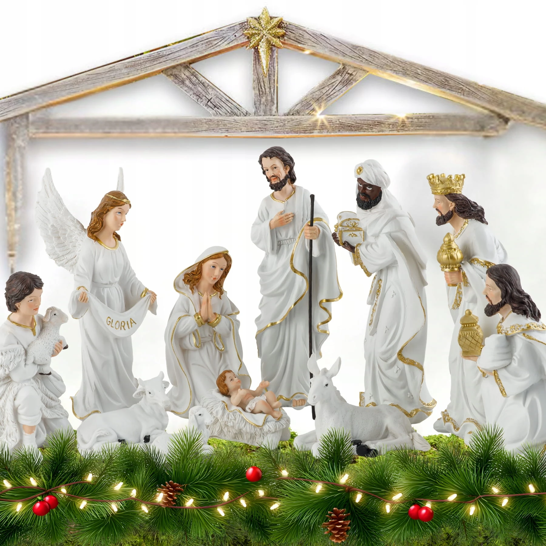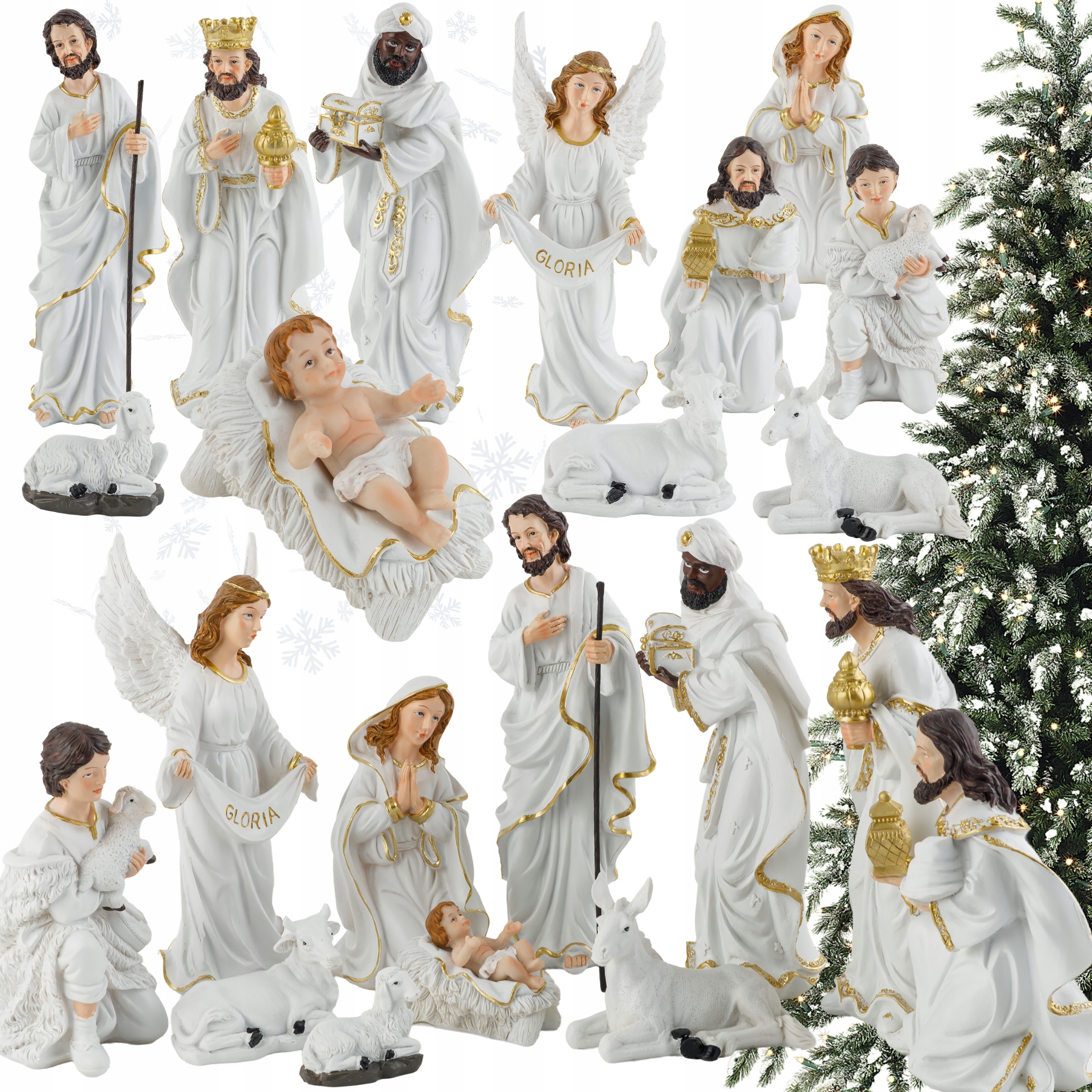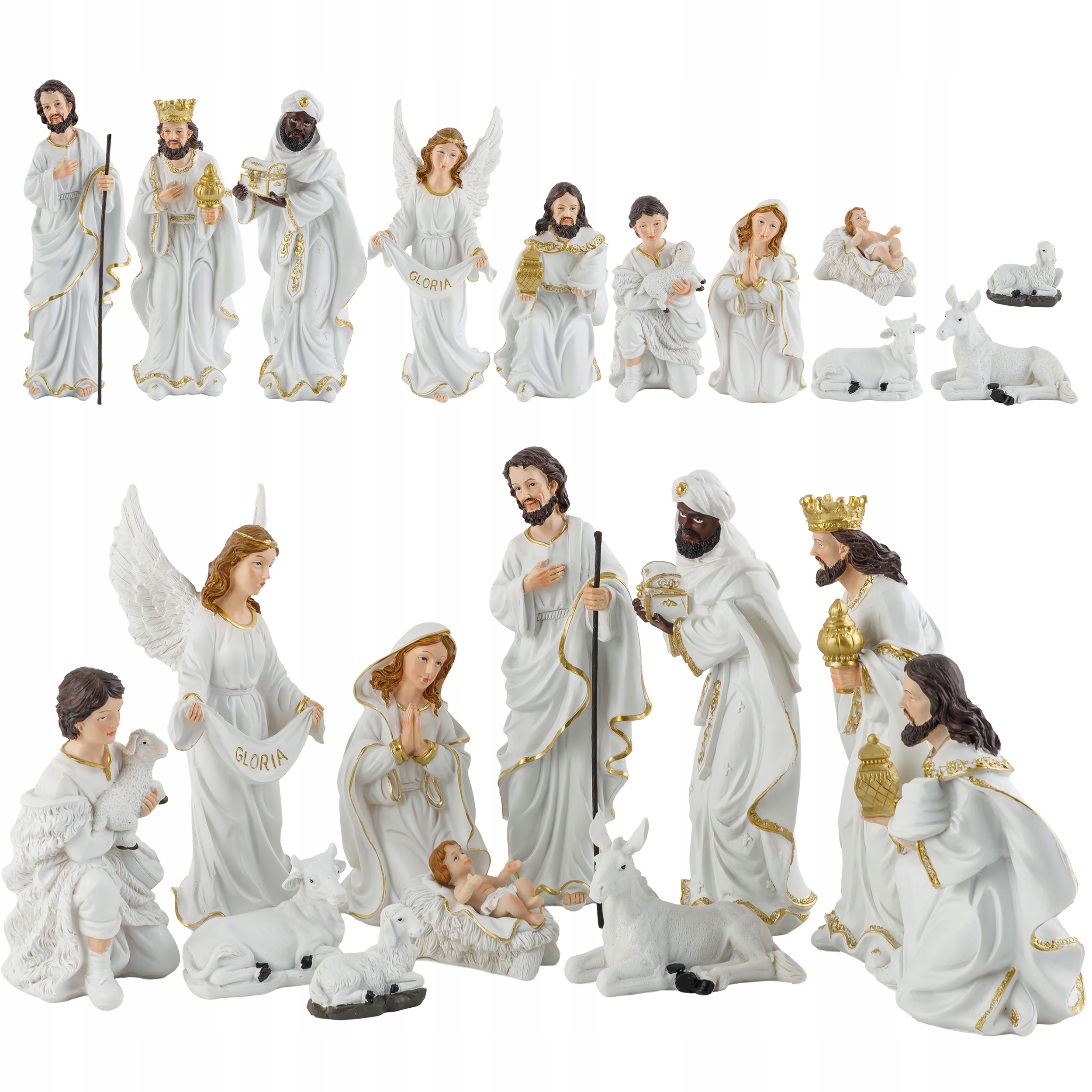 Figurki do szopki bożonarodzeniowej – kompletny zestaw 11 elementów, eleganckie biało-złote