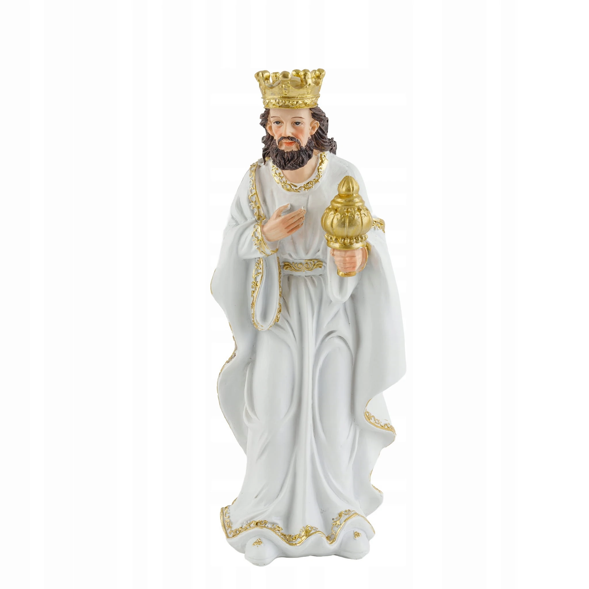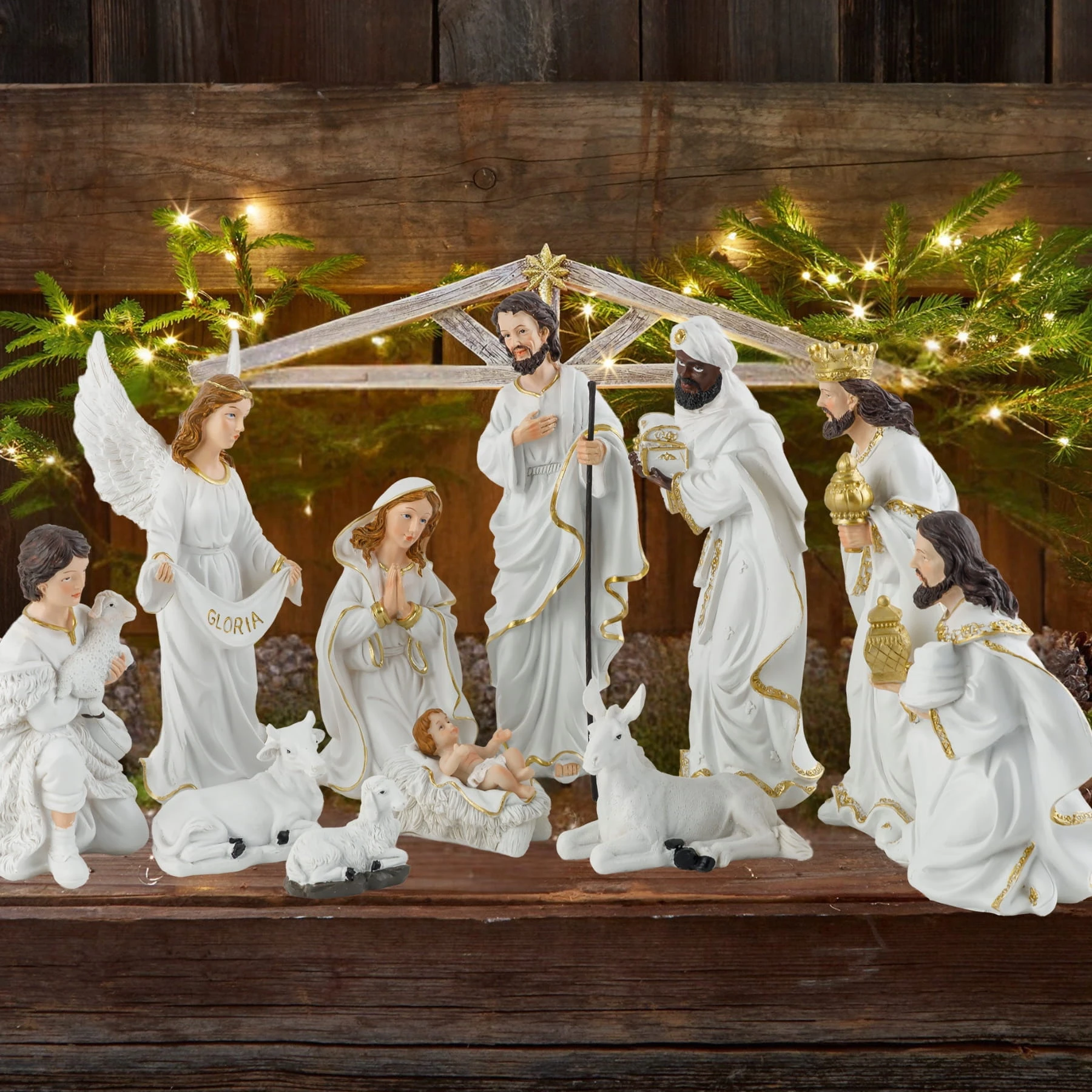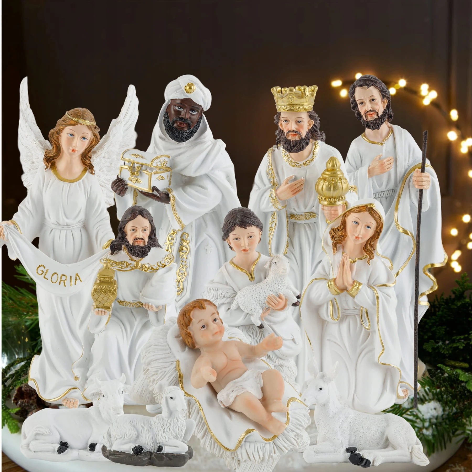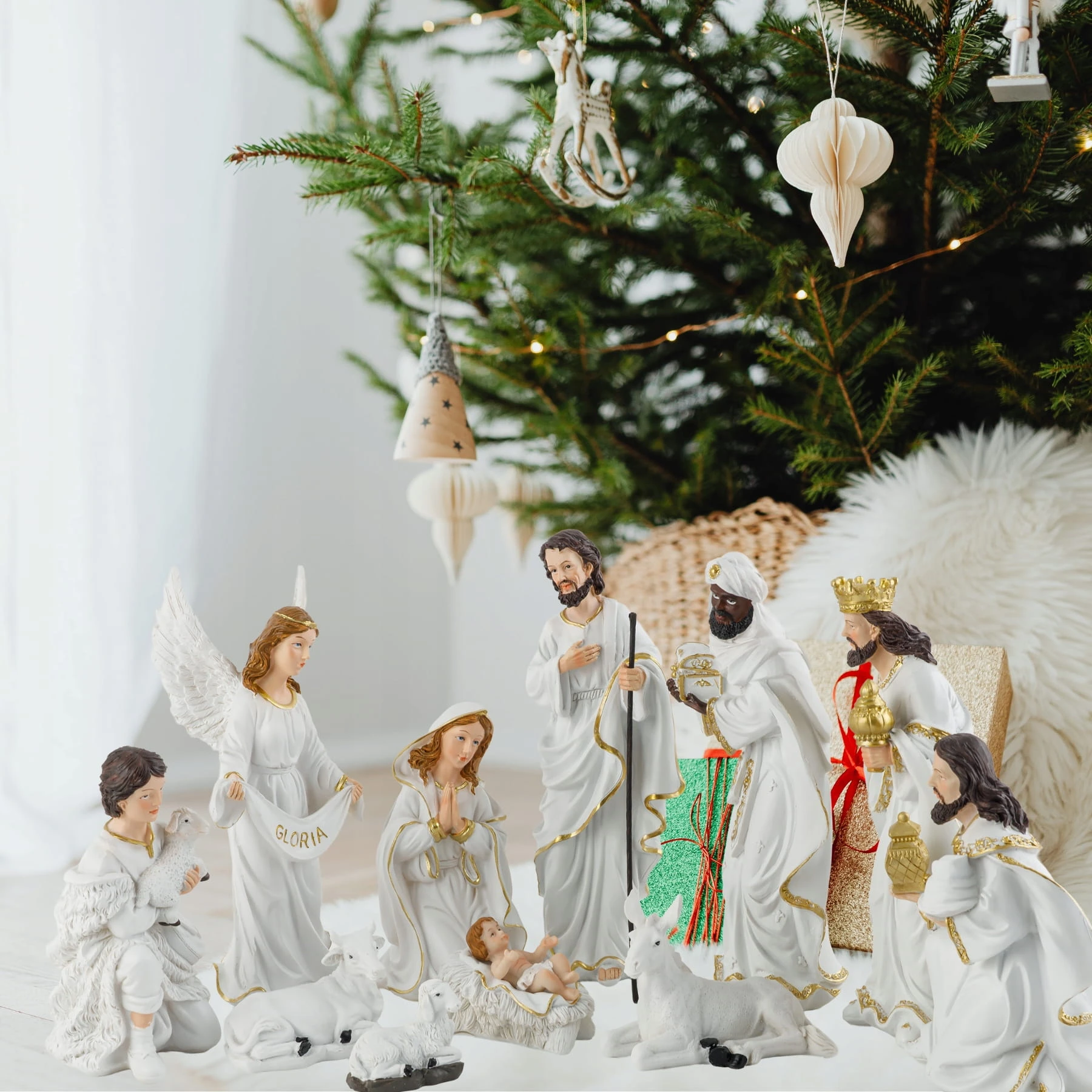 Figurki do szopki bożonarodzeniowej – kompletny zestaw 11 elementów, eleganckie biało-złote