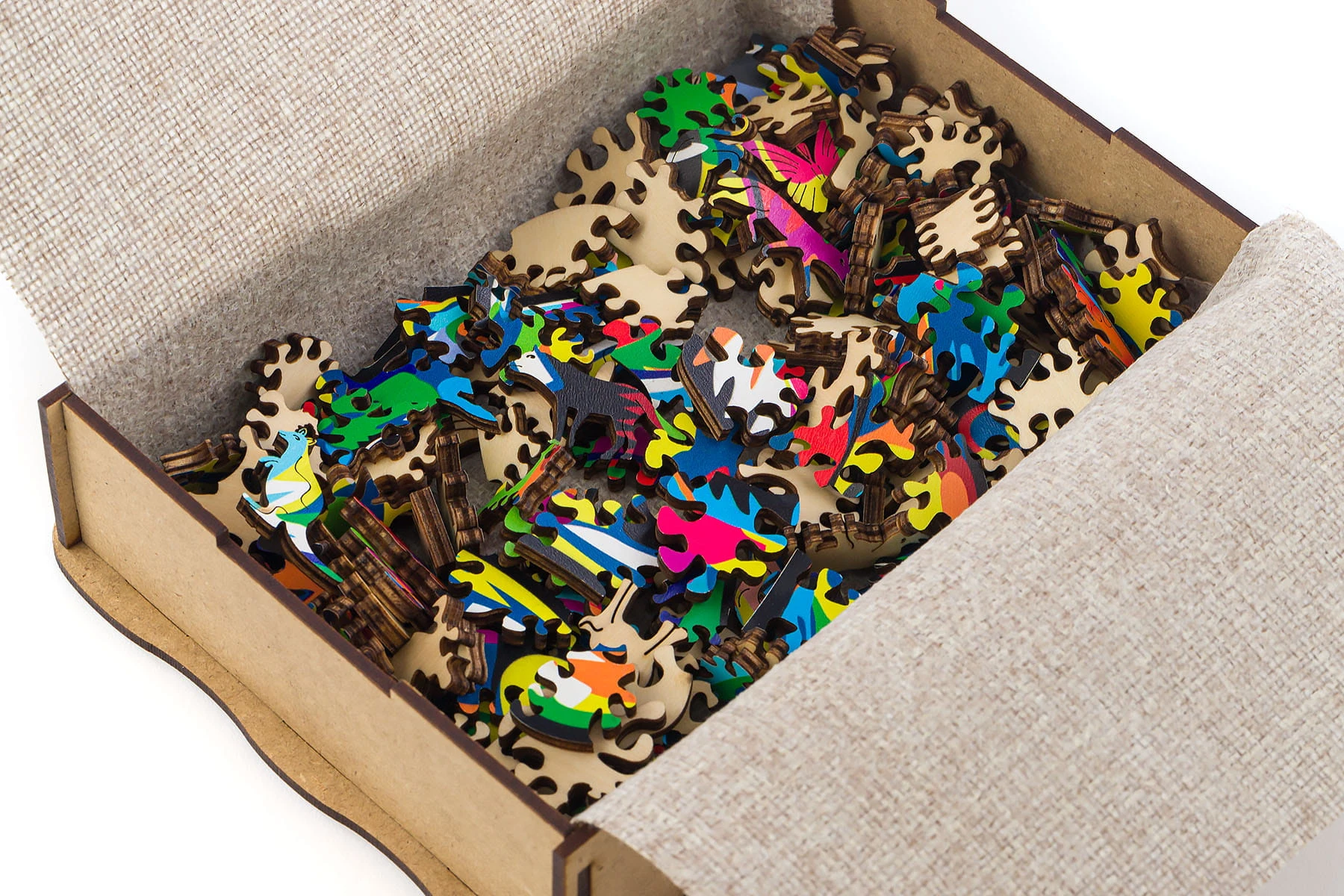 Kreatywna zabawa pobudzająca wyobraźnię i koncentrację. Puzzle drewniane dedykowane są dnia nieco starszych dzieci i osób dorosłych ze względu ma stopień skomplikowania układanki. Puzzle nie posiadają zakończeń oraz równych rogów przez co musimy się nieco bardziej nakombinować w trakcie układania. Motywem przewodnim drewnianych puzzli jest natura, dlatego poszczególne elementy układanki są w kształcie różnych gatunków zwierząt które tworzą obraz w postaci kota.