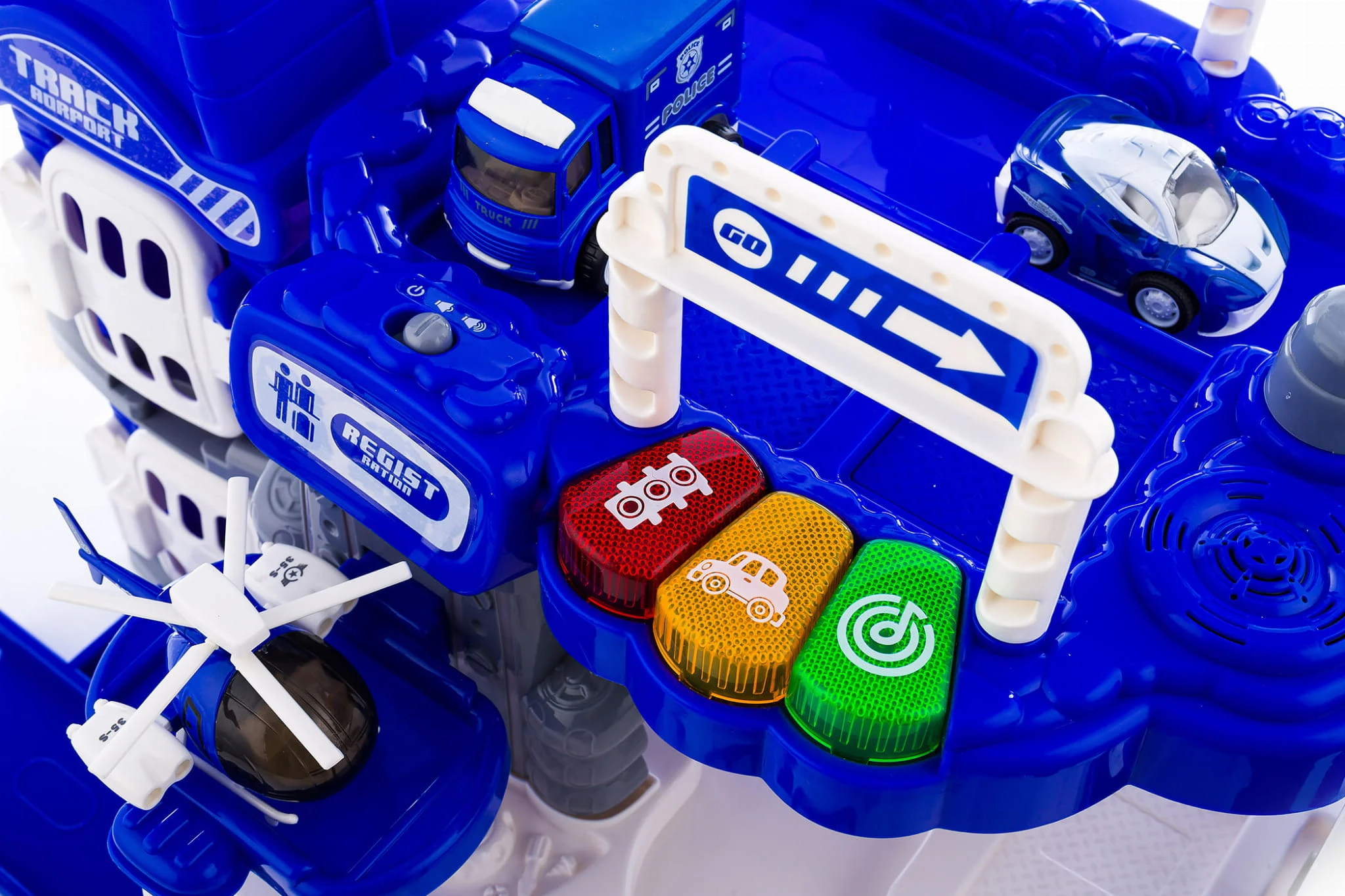 Zabawka wykonana jest z wysokiej jakości plastiku, posiada ruchome elementy, grające i świecące pianinko umieszczone na najwyższej kondygnacji parkingu oraz zestaw samochodzików do zabawy.