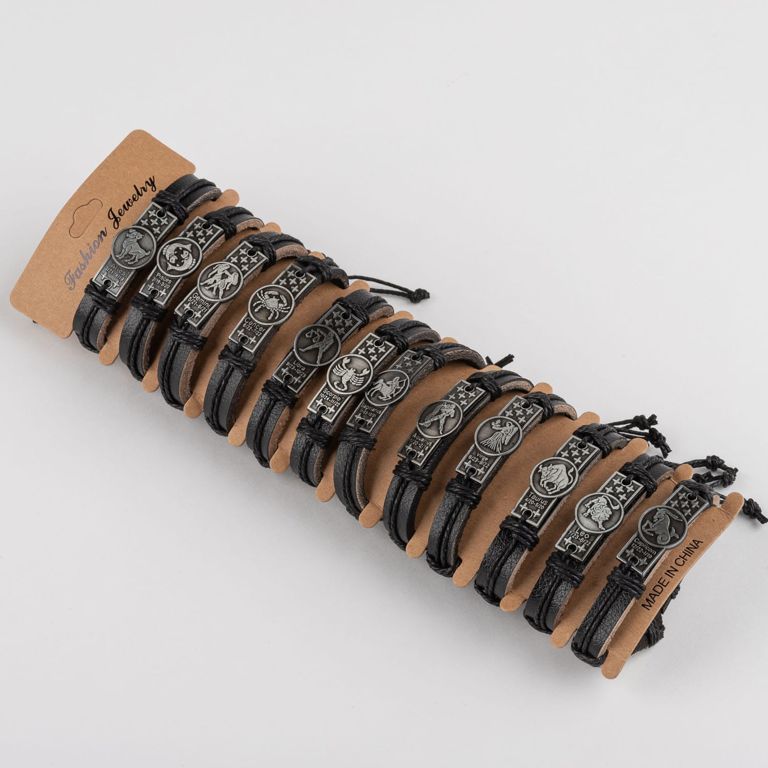 wzór: bransoletki skórzane ze znakami zodiaku