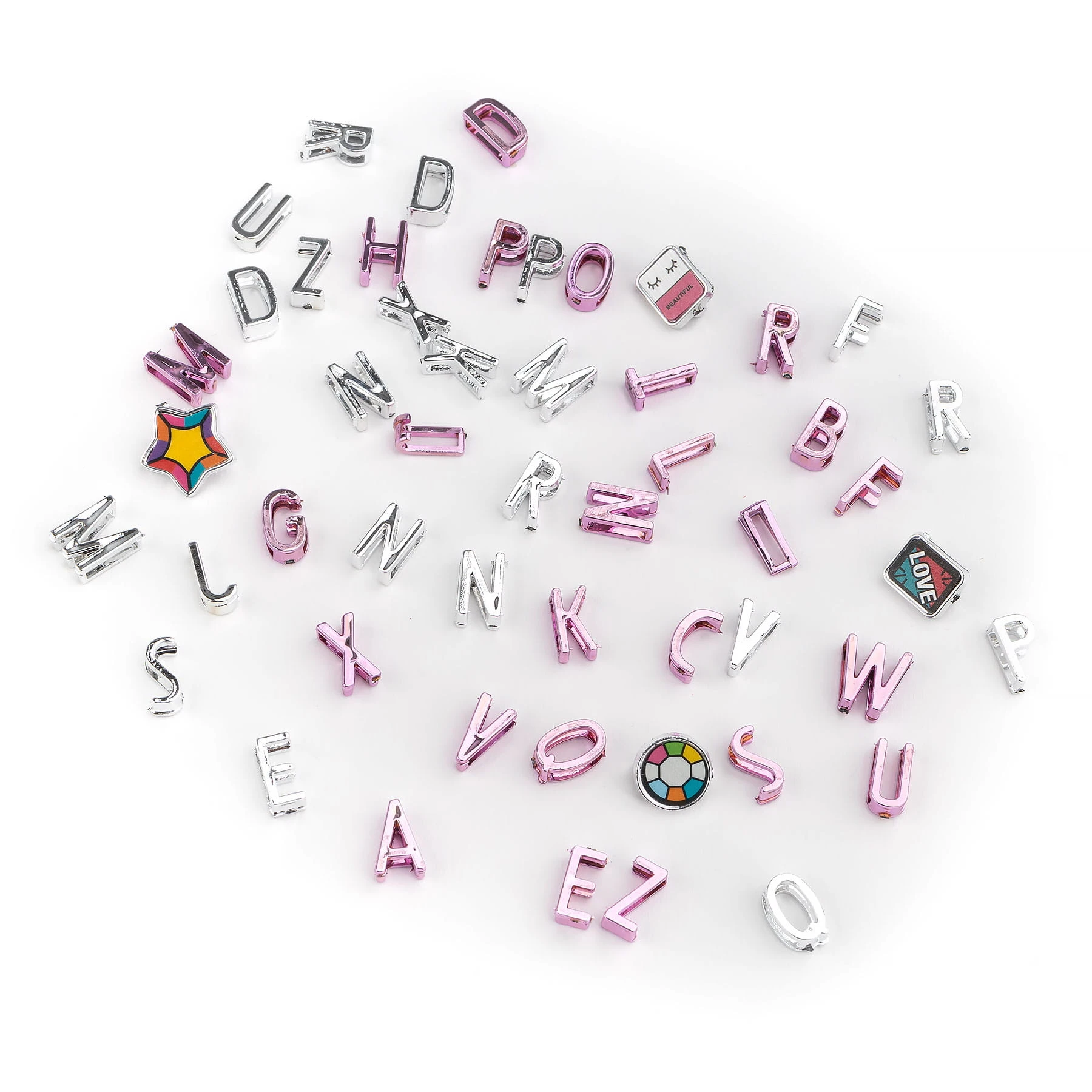 - 76szt. liter ( 2x cały alfabet) w kolorze srebra i różu
