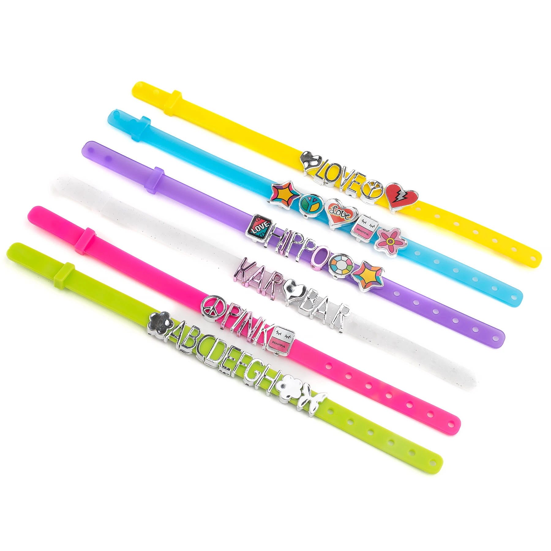 - 6 elastycznych pasków bransoletek w kolorach: biały, fiolet, zielony, różowy, niebieski, żółty
