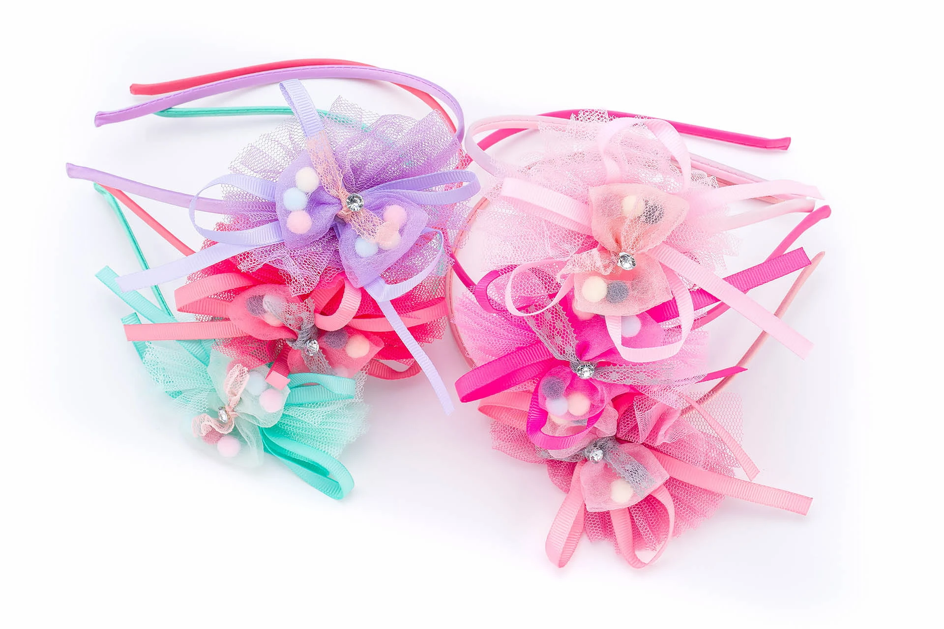 wzór: opaska materiałowa z tiulem, kokardką i pomponem