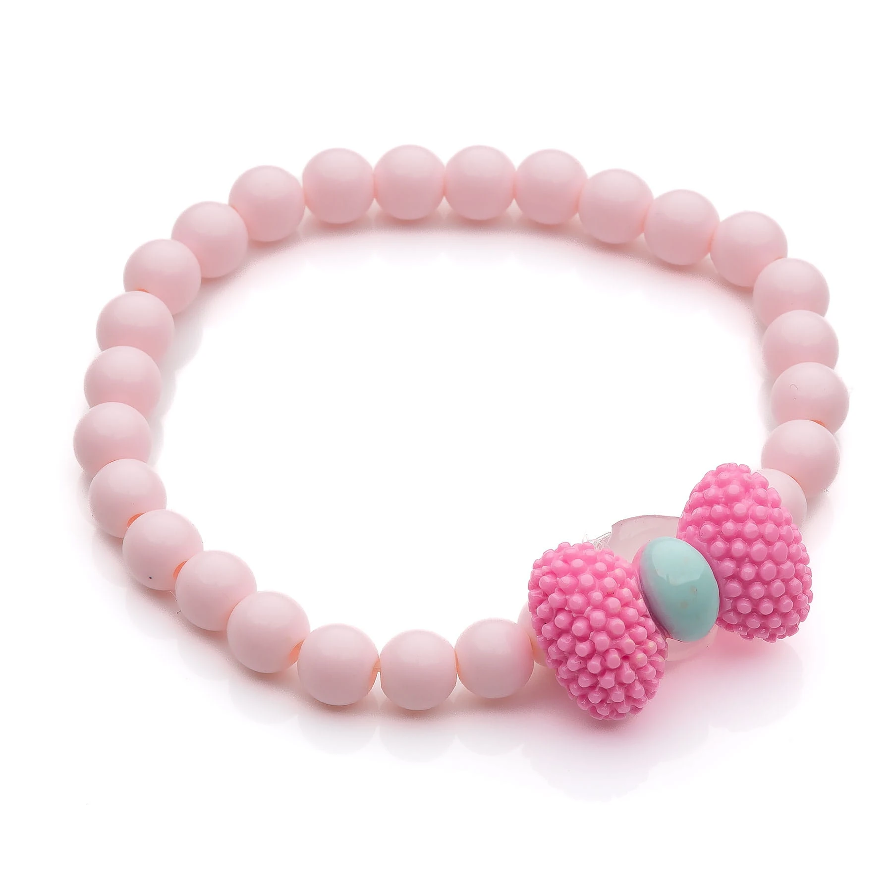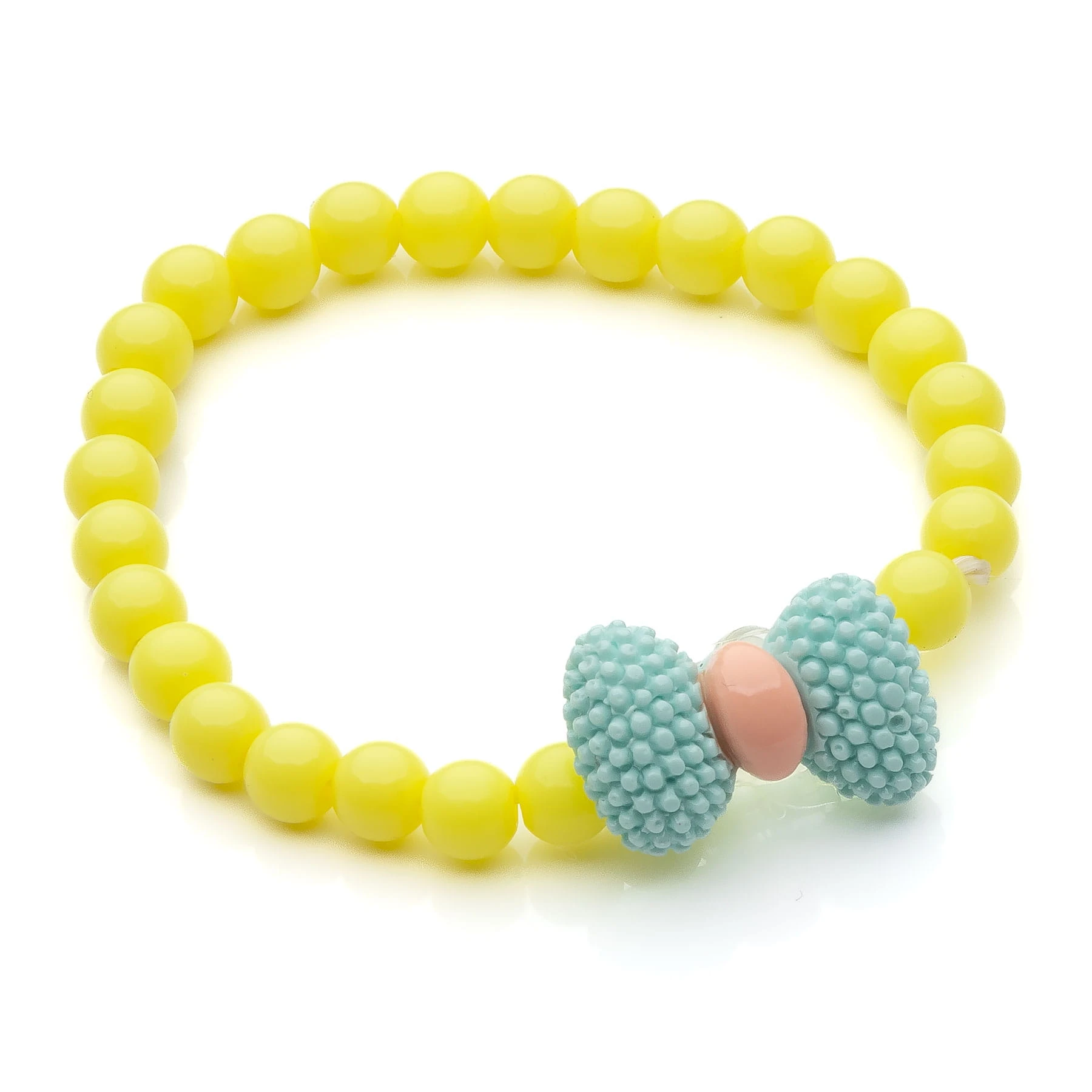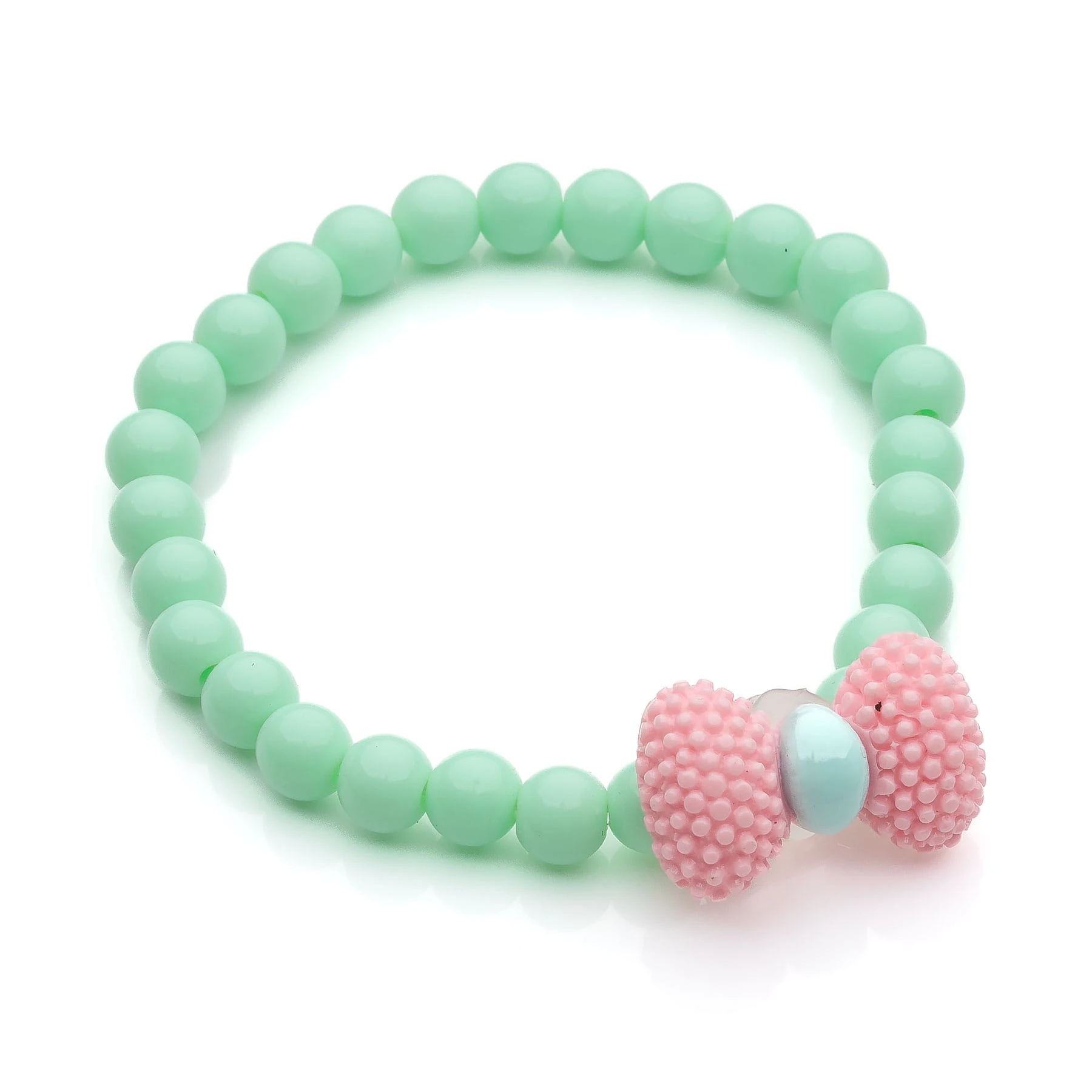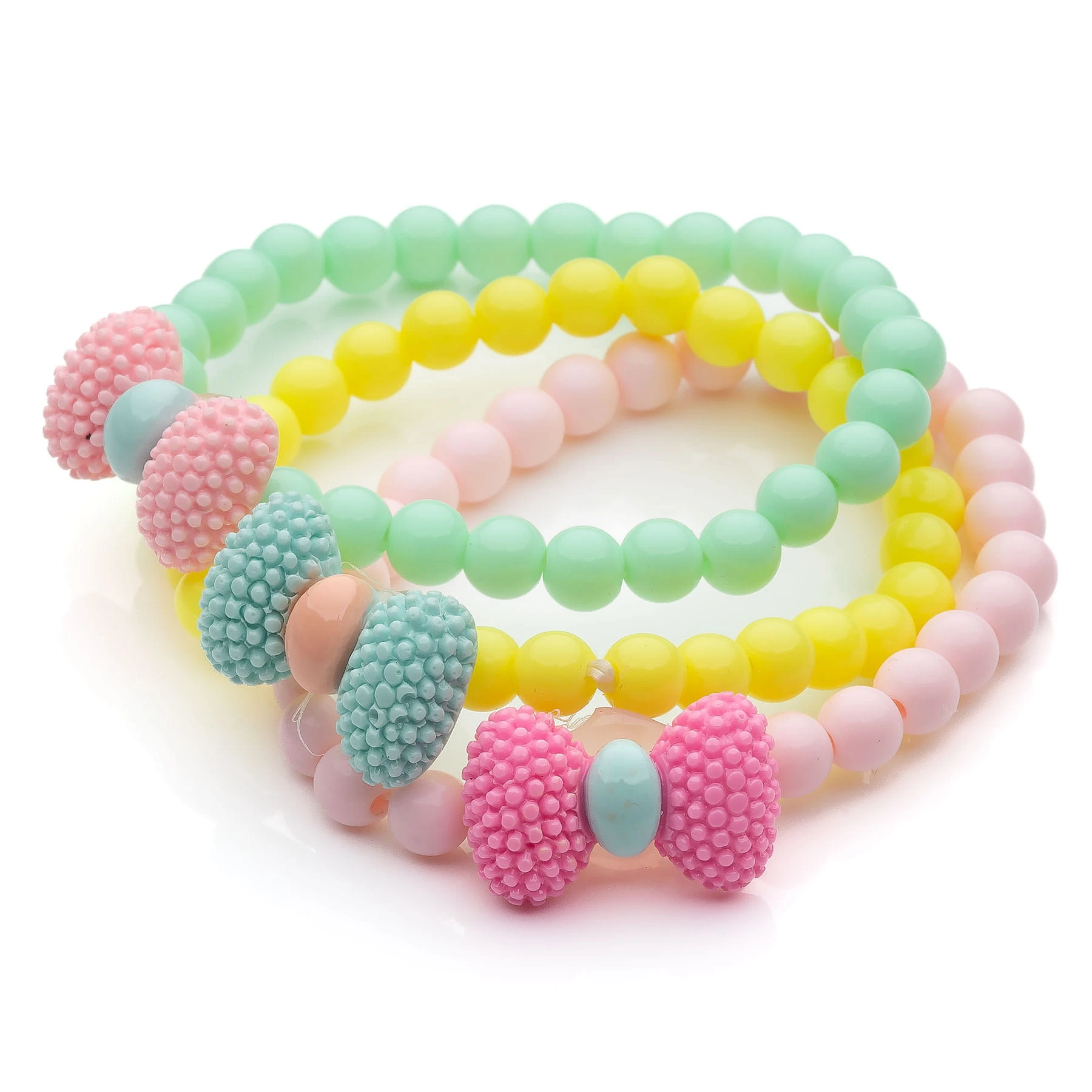 wzór: zestaw trzech pastelowych bransoletek na gumce z pastelowych koralików z kokardką